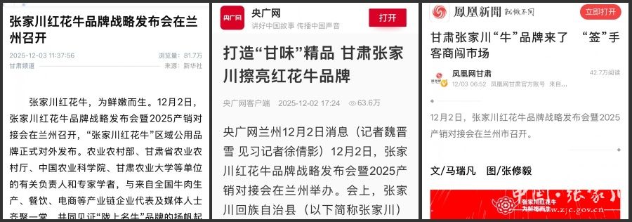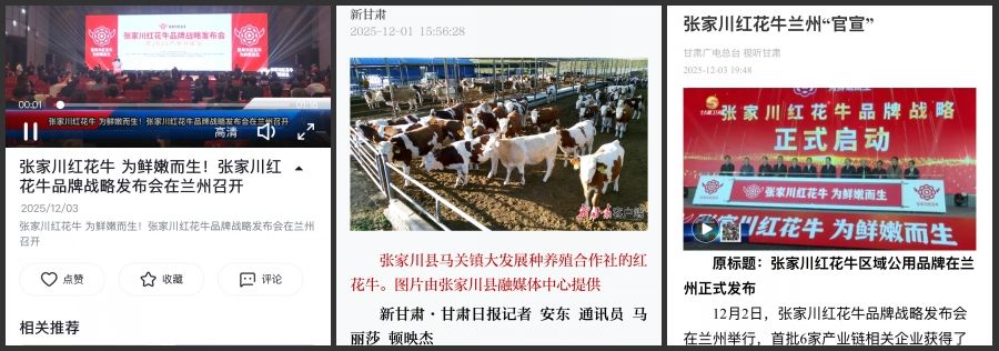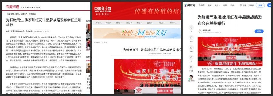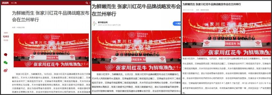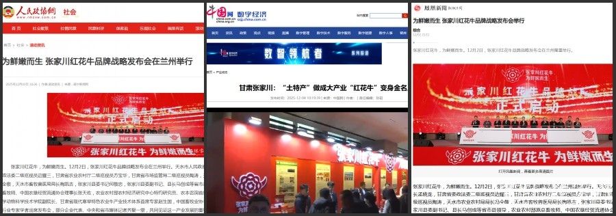 截至目前,新華社甘肅頻道、人民政協(xié)網(wǎng)、人民日?qǐng)?bào)社《經(jīng)濟(jì)周刊》、經(jīng)濟(jì)日?qǐng)?bào)社《中國(guó)經(jīng)濟(jì)網(wǎng)》、央廣網(wǎng)、央視頻、鳳凰網(wǎng)、騰訊新聞、網(wǎng)易新聞、環(huán)球網(wǎng)、搜狐新聞、新浪新聞客戶端、中國(guó)網(wǎng)、鳳凰新聞、和訊新聞、新華報(bào)業(yè)網(wǎng)、甘肅日?qǐng)?bào)、甘肅電視臺(tái)、甘肅農(nóng)民報(bào)、甘肅經(jīng)濟(jì)日?qǐng)?bào)、天水融媒、天水在線和張家川融媒等中央、省市縣媒體已通過圖文、視頻等多種形式展開立體報(bào)道,相關(guān)話題持續(xù)引發(fā)社會(huì)關(guān)注。隨著媒體傳播的持續(xù)發(fā)酵,張家川紅花牛正以更鮮明的品牌形象、更優(yōu)質(zhì)的產(chǎn)品口碑,走出甘肅、走向全國(guó),讓更多人領(lǐng)略“隴上名?!钡莫?dú)特魅力。