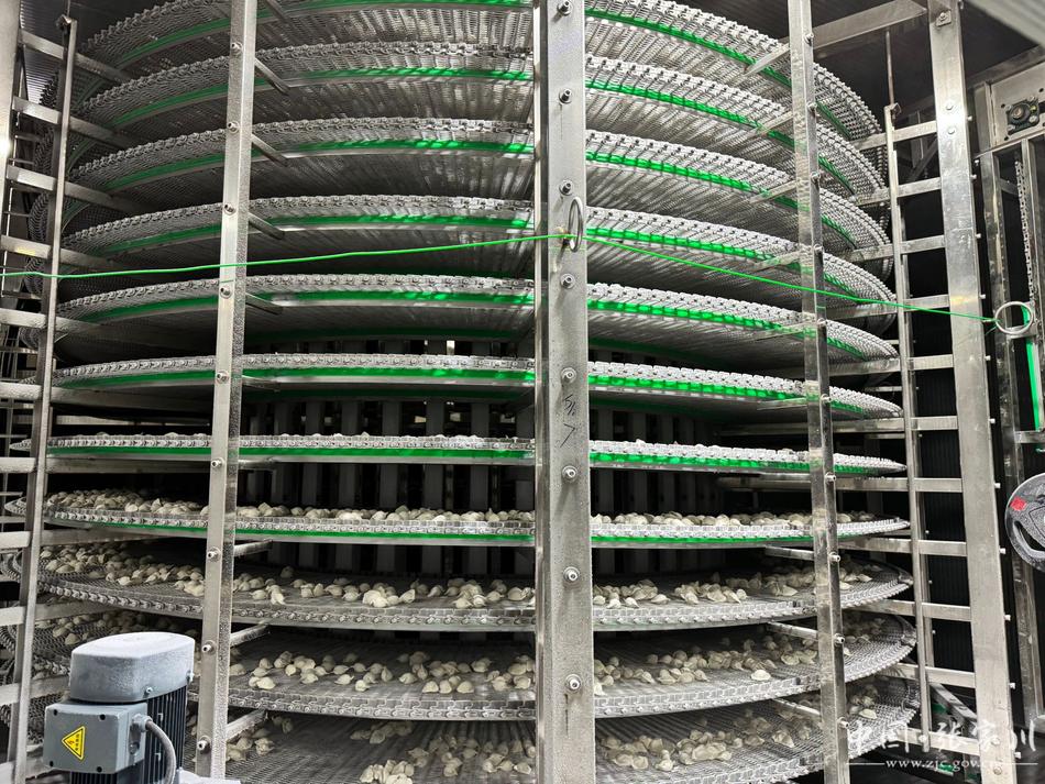 通過傳送帶,等待新鮮水餃的是一個(gè)巨大的魔法屋——隧道螺旋速凍機(jī),這臺機(jī)器能將水餃瞬間鎖鮮,讓紅花牛肉的鮮嫩和蔬菜的新鮮最大程度地保存下來,有效提高水餃品質(zhì)。隨后新鮮的恒香水餃被打包裝箱進(jìn)入冷庫,等待冷鏈車的運(yùn)輸。
