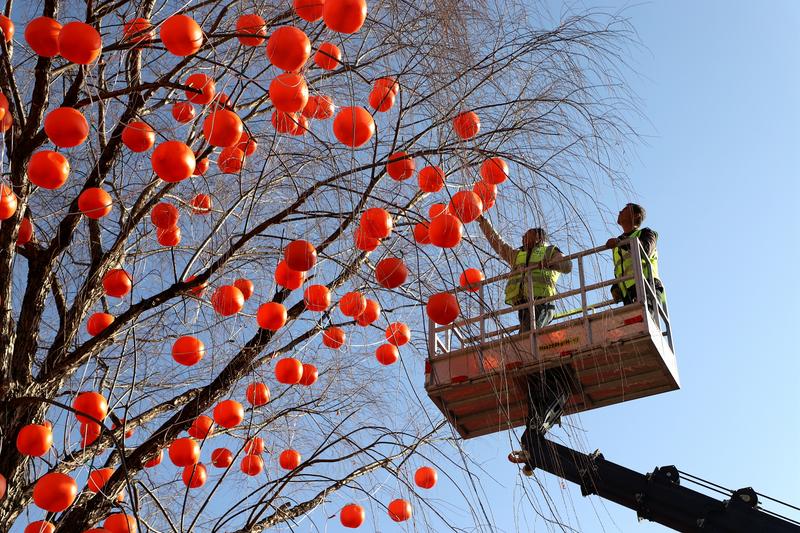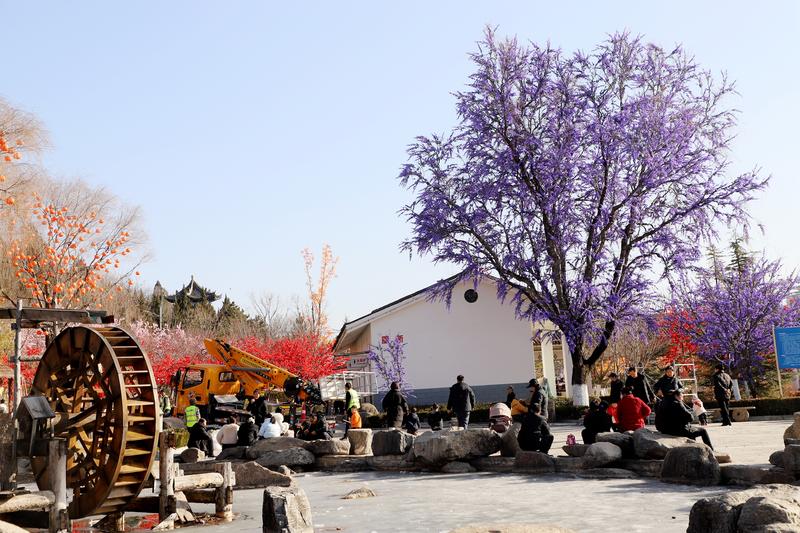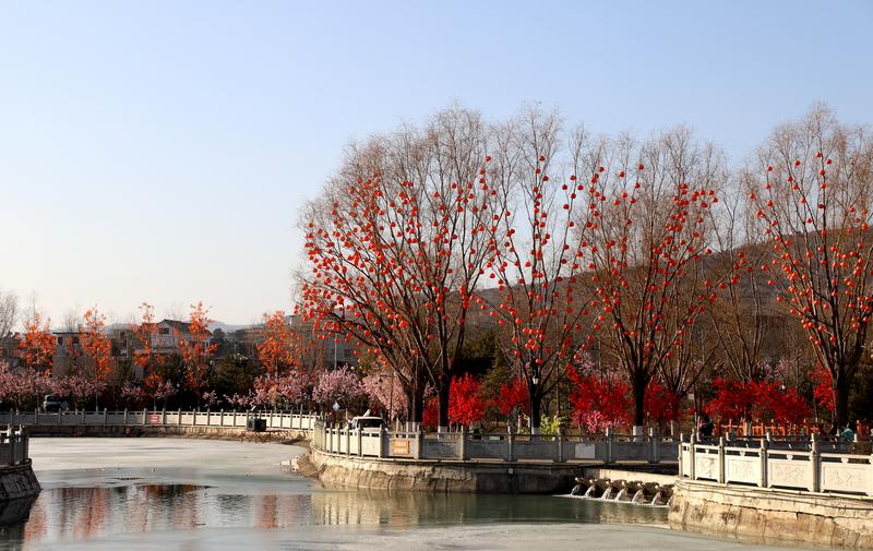 軒轅湖公園內(nèi),冬日的景致因節(jié)慶布置煥發(fā)出別樣生機(jī)。沿湖的樹木上,粉色桃花、艷紅梅花錯落綻放,與金黃的柿子造型、紅彤彤的燈籠交相輝映,一串串燈籠垂掛枝頭,隨風(fēng)輕晃,光影流轉(zhuǎn)間滿是吉祥寓意。