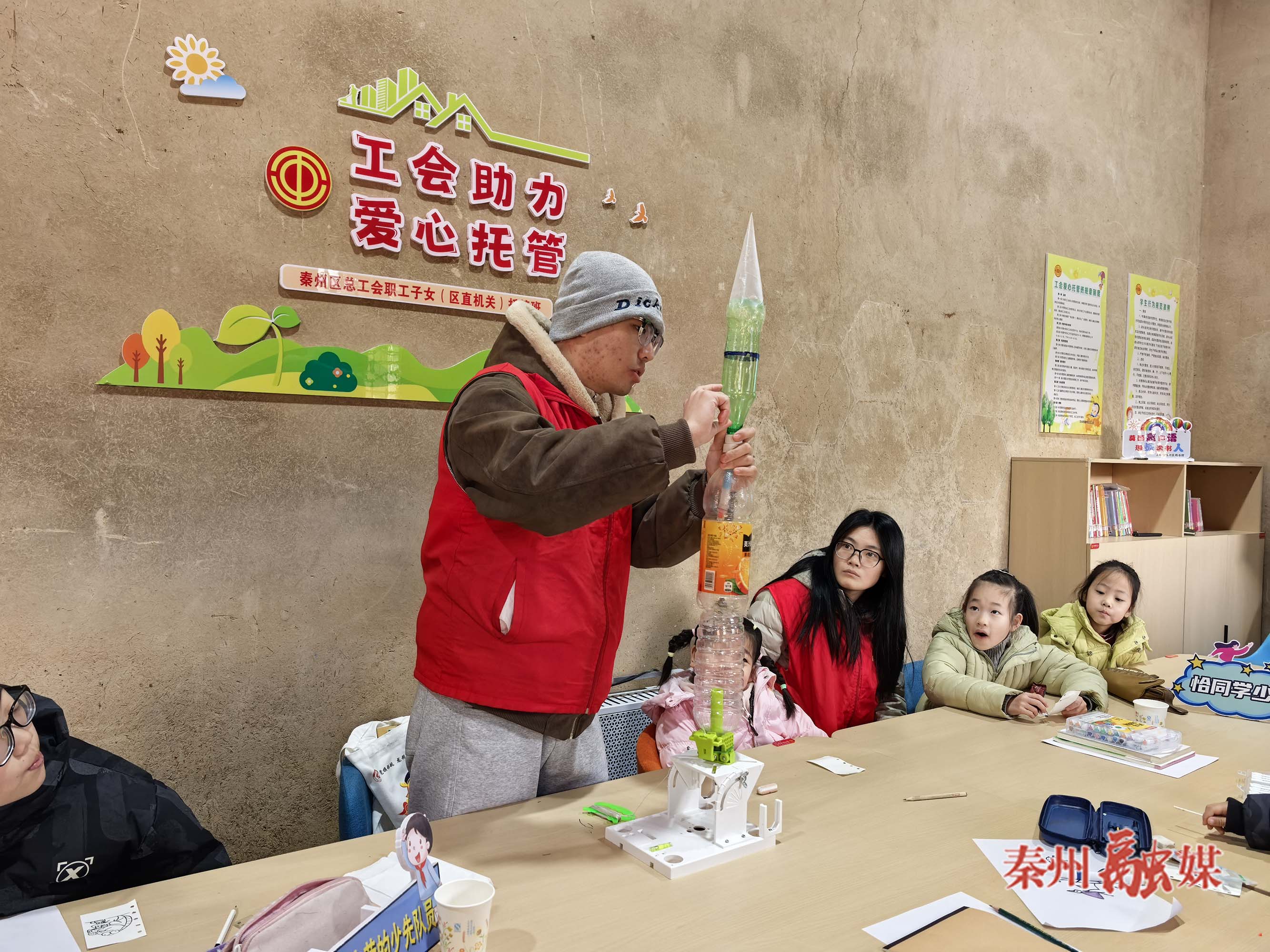 “我第一次參加愛心托管班,這里又可以學(xué)習(xí)又可以做游戲,我們今天還玩了‘水火箭’,我覺得很好玩?!毙∨笥掩w瑄瑀說。
