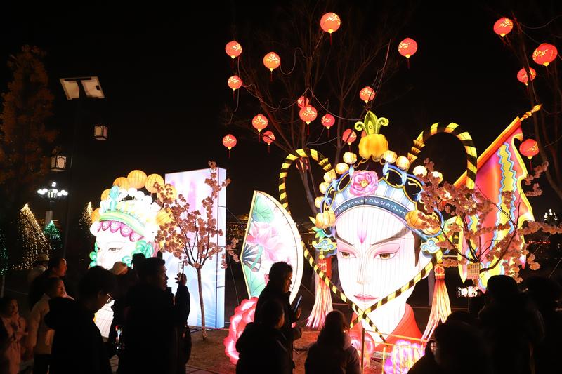 步入公園,連接兩岸的拱橋已是人流如織。數(shù)排暖黃色的宮燈沿橋廊優(yōu)雅懸掛,燈紗上繪著梅蘭竹菊等雅致紋樣,在夜色中暈開柔和光暈,與軒轅湖公園古樸的飛檐翹角相映成趣,恍如步入一幅流動(dòng)的國風(fēng)畫卷。越過小橋,便真正墜入了燈的星河。氣勢磅礴的“將軍策馬”主題燈組昂首欲飛,周身流光溢彩;花燈長廊下,數(shù)百盞由全縣干部群眾親手扎制的宮燈、生肖燈、錦鯉燈織就一條流光通道。目光所及,更有眾多精巧裝置燈點(diǎn)綴其間:莊嚴(yán)典雅的國風(fēng)花臉落地?zé)粞堇[戲曲神韻,靈動(dòng)翩躚的鯉魚飛鶴燈寄托年年有余、松鶴延年的美好寓意,花叢玫瑰燈在步道旁悄然“盛放”,而孔雀漫步、熊貓嬉戲、哪吒敖丙等童趣裝置燈區(qū),則成了孩子們流連忘返的童話樂園。