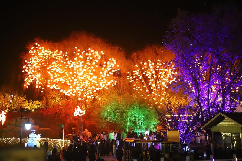 更令人贊嘆的是,園林匠心中深植本土情懷。湖畔樹下,處處裝點(diǎn)著燈籠與仿真花材,簇簇丁香紫、暖柿橙交錯(cuò)點(diǎn)綴,仿若云霞棲落枝頭,不僅呼應(yīng)了清水“丁香名縣”的生態(tài)品牌,更巧妙延續(xù)了此前“柿柿如意”鄉(xiāng)村文旅活動(dòng)的溫暖意象。盡管時(shí)值寒冬,軒轅湖公園卻因這滿園燈影與“花”意,煥發(fā)出盎然春趣,實(shí)現(xiàn)了“人在燈中走,如在畫中游”的沉浸詩意。