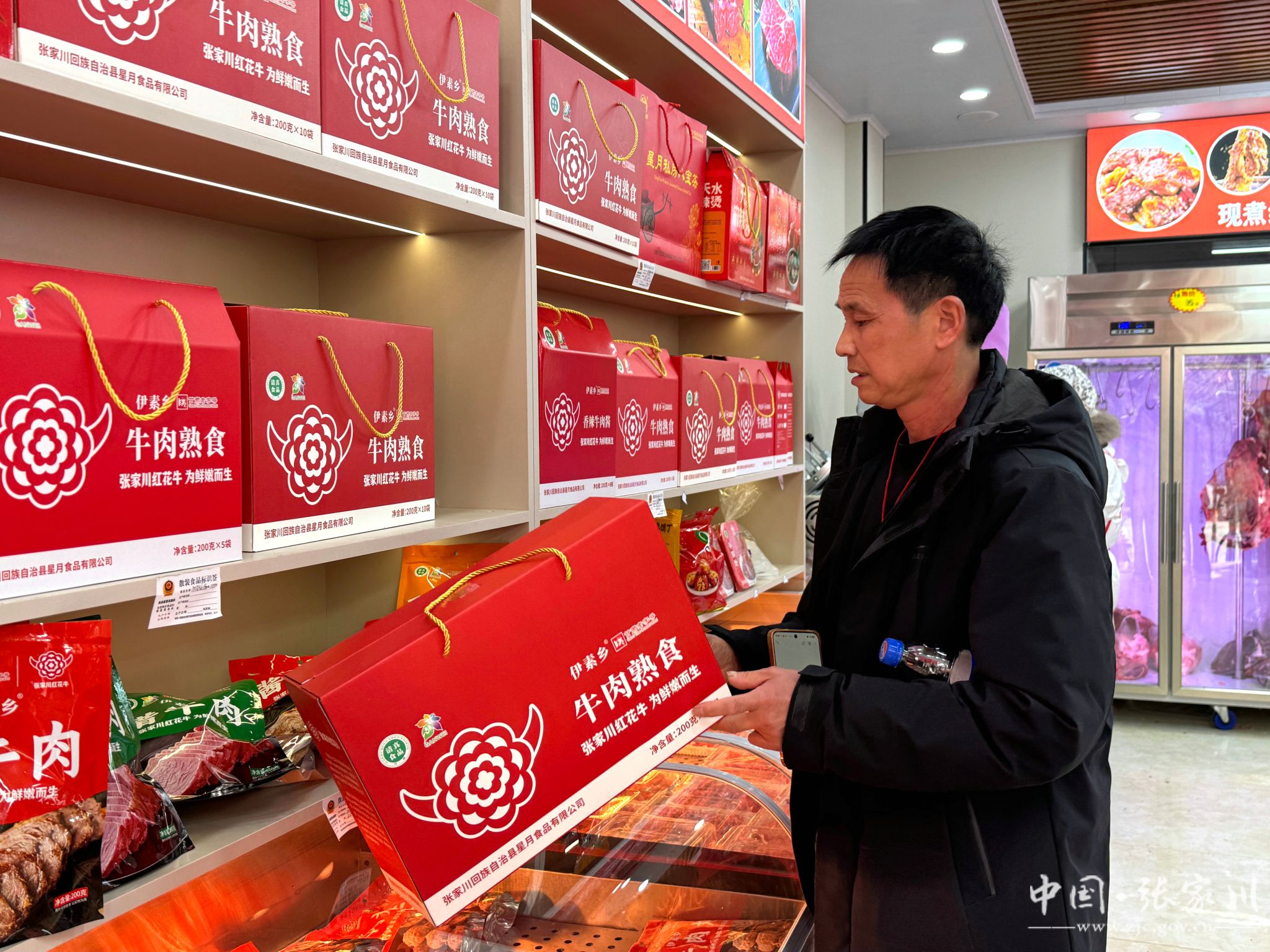 在西城南路的紅花牛品牌專賣(mài)店,采購(gòu)禮盒的市民排起長(zhǎng)隊(duì),不少外地游客專程打卡。付煥元來(lái)自湖北鄂州,來(lái)張家川參加女兒的婚禮,在婚宴上品嘗過(guò)紅花牛肉覺(jué)得味道非常不錯(cuò),返鄉(xiāng)前慕名而來(lái)特意到店選購(gòu):“肉質(zhì)好、味道香,帶回去給家人嘗嘗!”