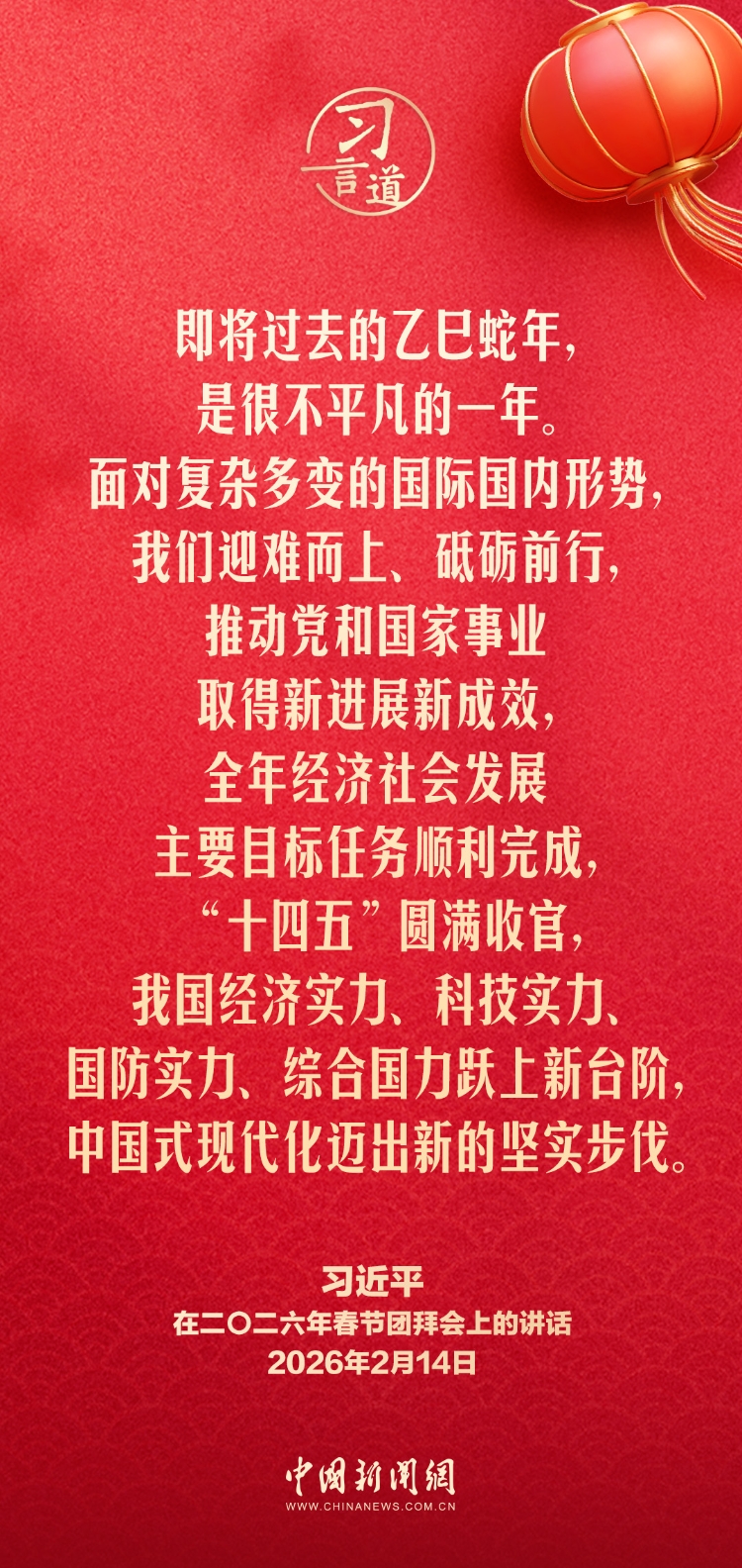 2月14日,中共中央、國務(wù)院在人民大會(huì)堂舉行2026年春節(jié)團(tuán)拜會(huì)。中共中央總書記、國家主席、中央軍委主席習(xí)近平發(fā)表講話,代表黨中央和國務(wù)院,向全國各族人民,向香港特別行政區(qū)同胞、澳門特別行政區(qū)同胞、臺灣同胞和海外僑胞拜年。他指出——
